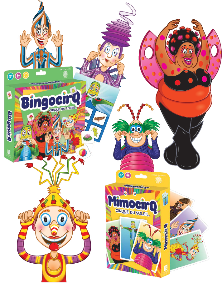 Illustrations de Marc Chouinard pour les jeux de société Mimocirq et Bingocirq de Pierre Belvédère et le Cirque du Soleil.